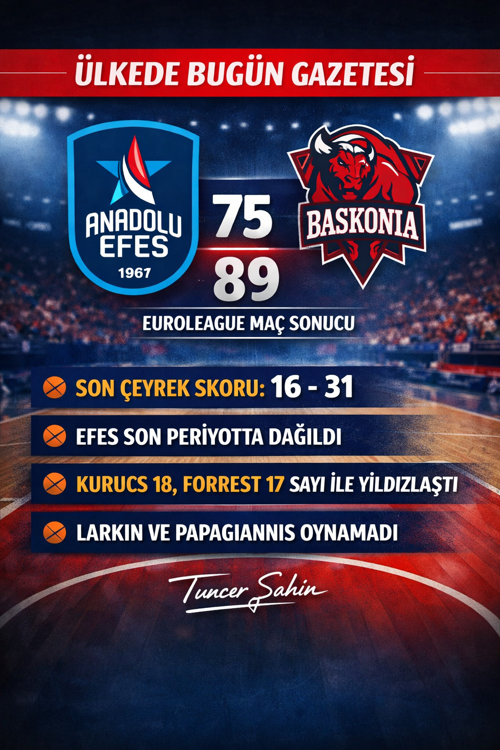 Efes hücumda ritmini kaybederken, Baskonia arka arkaya bulduğu sayılarla farkı açtı ve kritik bir deplasman galibiyeti aldı. Bu sonuçla Anadolu Efes EuroLeague’de iç sahada önemli bir kayıp yaşadı.